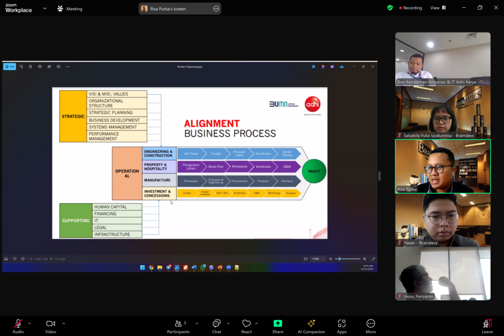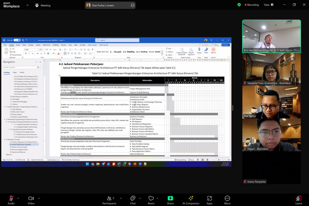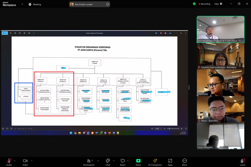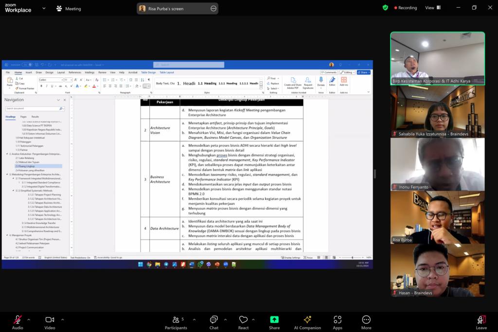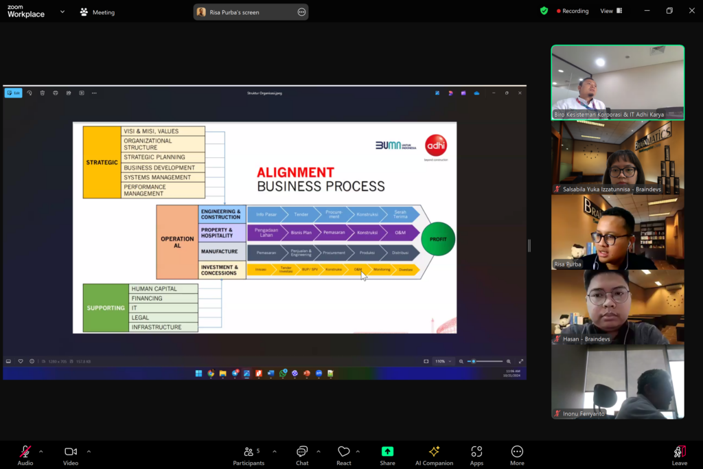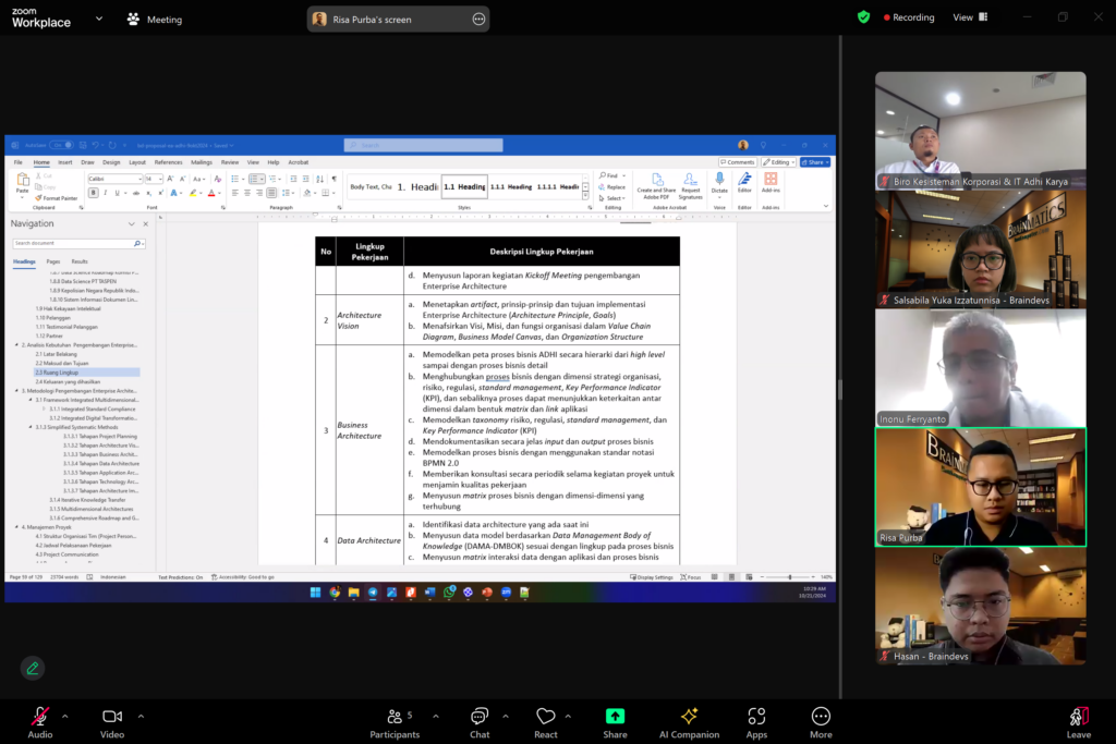 Dokumentasi Meeting Proposal Pengembangan Enterprise Architecture (EA) PT Adhi Karya (Persero), kegiatan ini telah dilaksanakan pada hari Senin, 21 Oktober 2024 secara online melalui Zoom Meeting dan dihadiri oleh Tim Biro Kesisteman Korporasi & IT Adhi Karya serta Tim Braindevs