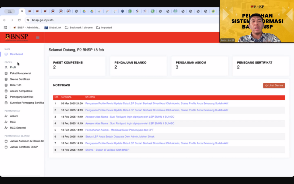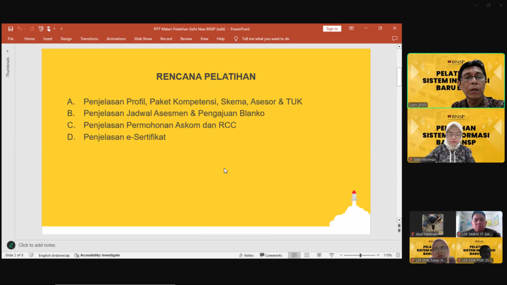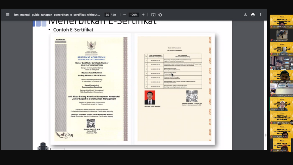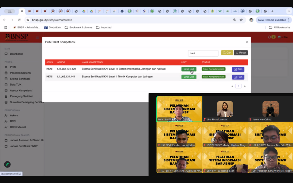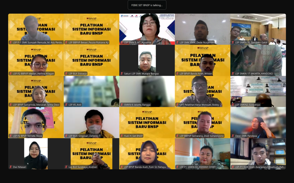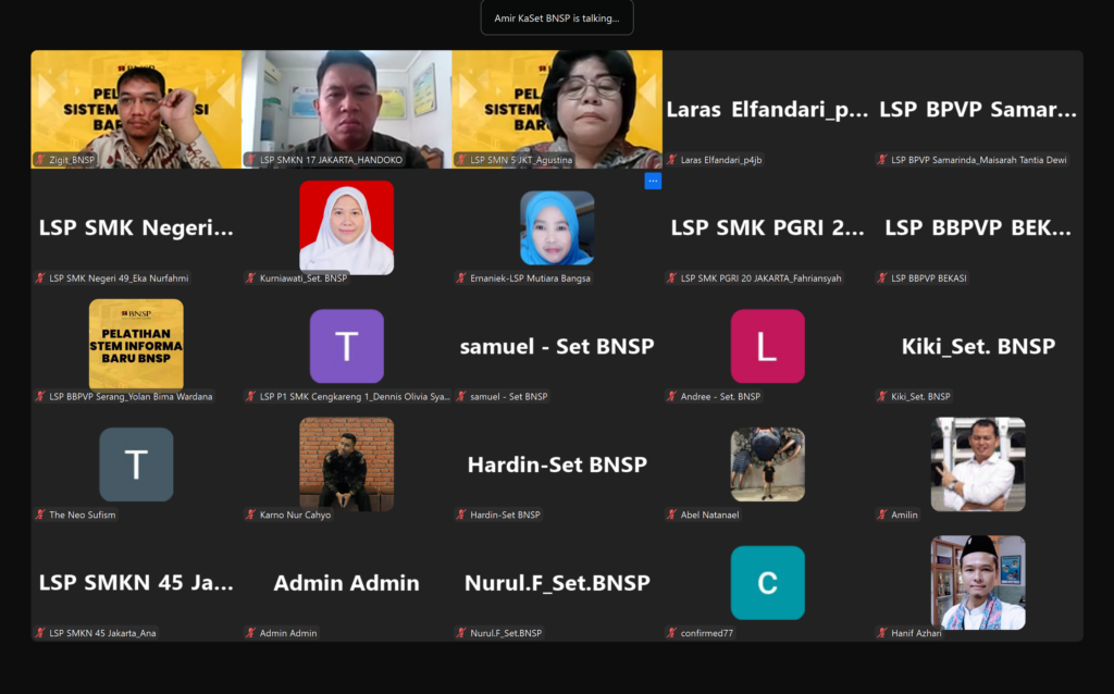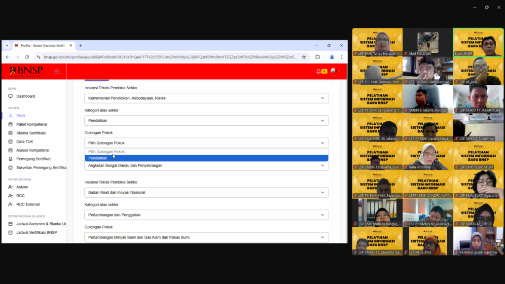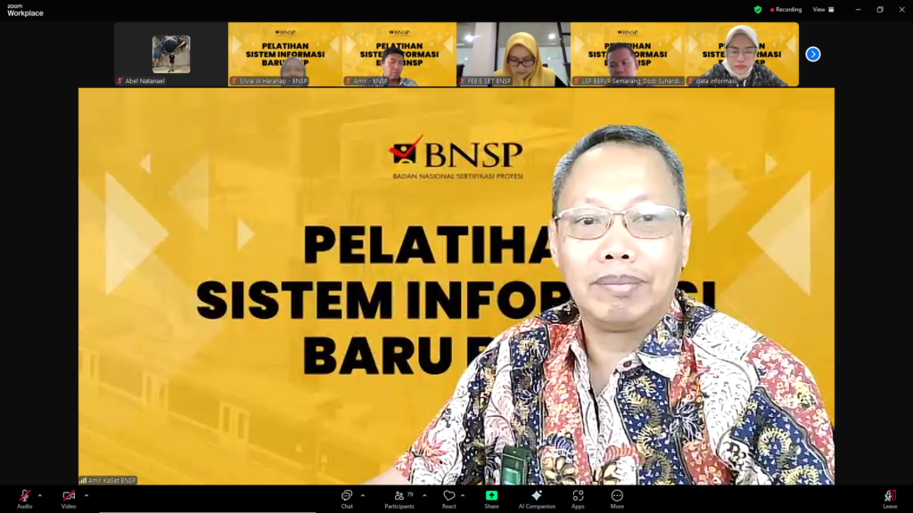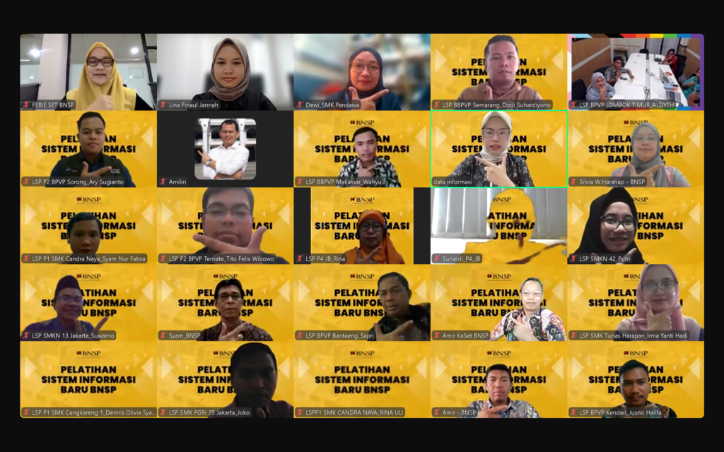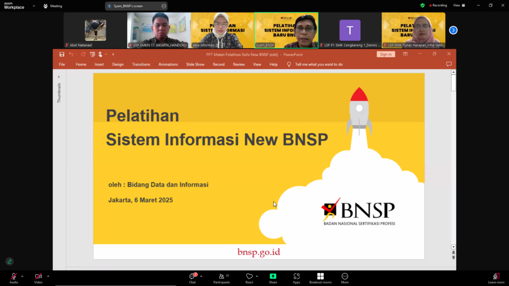 Dokumentasi kegiatan Pelatihan Sistem Informasi Baru BNSP yang dilaksanakan secara online pada Kamis, 6 Maret 2025.