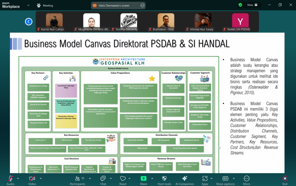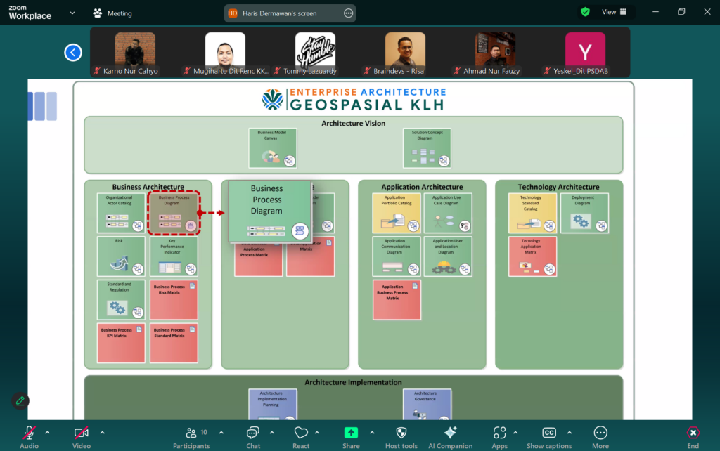 Pengembangan Enterprise Architecture (EA) untuk Sistem Informasi Geospasial KLH terus berlanjut! Dalam pertemuan mingguan yang berlangsung di ruang rapat Direktorat Penyelenggaraan SDA Berkelanjutan, para koordinator, pejabat pengadaan, serta tim Braindevs duduk bersama untuk mengevaluasi progres empat domain utama: Business, Data, Application, dan Technology Architecture.