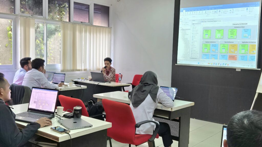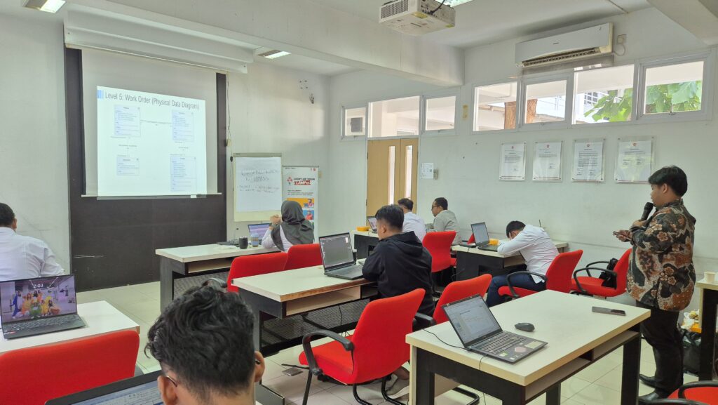 Hari pertama di Kantor Adhi Karya, Pasar Minggu difokuskan pada pendalaman data architecture, mencakup Conceptual–Logical–Physical Data, serta praktik reverse dan forward engineering. Hari kedua membahas domain Application dan Technology, mulai dari Use Case Diagram, Software Request, analisis kelayakan, hingga penyusunan Technology Matrix dan Network Communication Diagram.